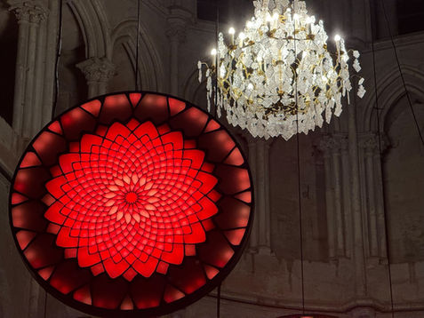 Cette œuvre lumineuse et sonore se fonde sur l’observation du tournesol, dont la structure en spirale révèle un principe de géométrie sacrée. Ce motif, omniprésent dans la nature, trouve un écho dans l’architecture humaine, notamment dans les rosaces des cathédrales, où la lumière est sublimée pour inspirer un sentiment de transcendance.